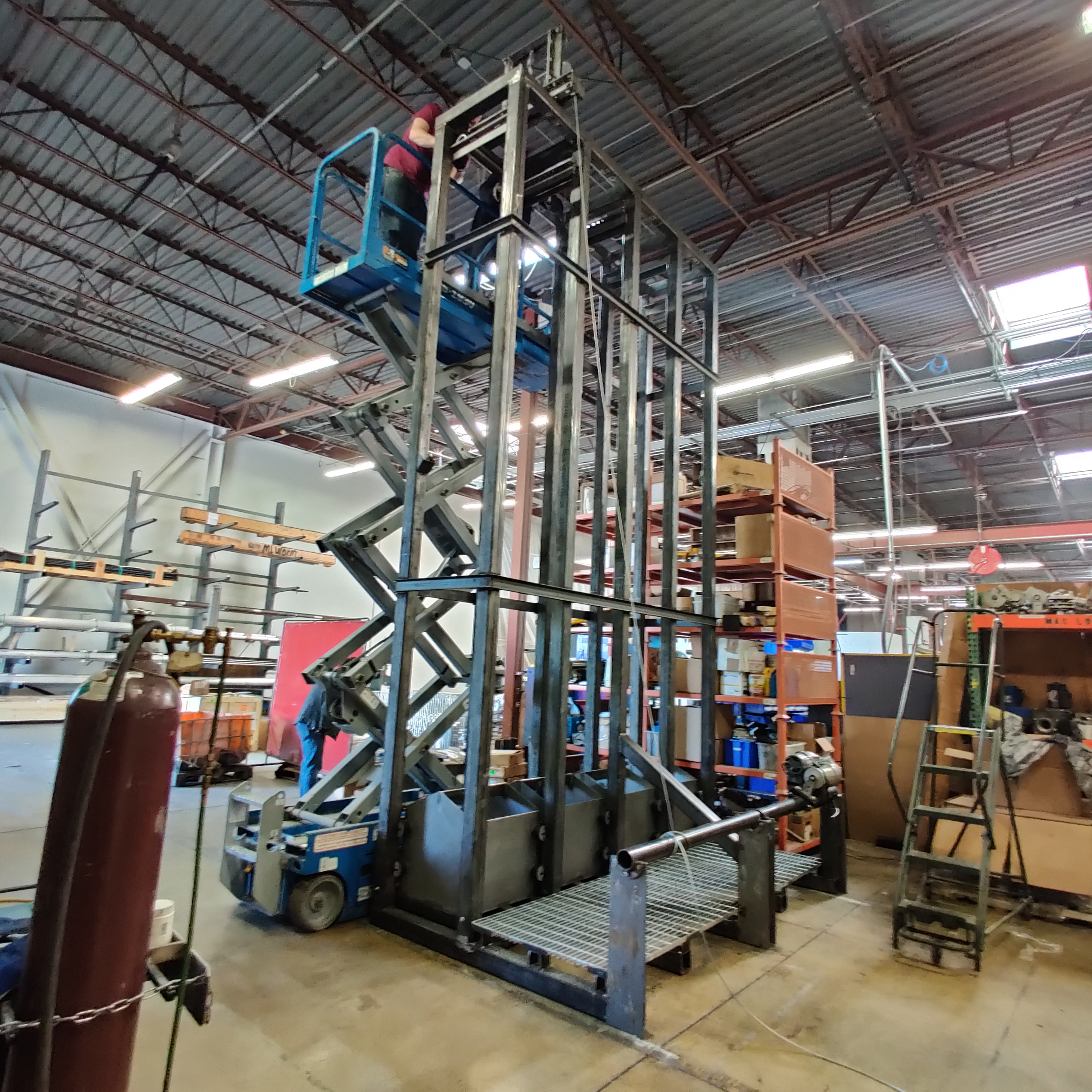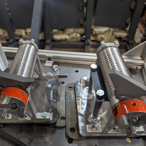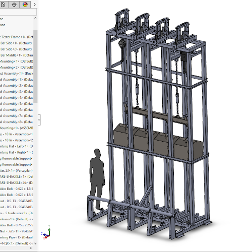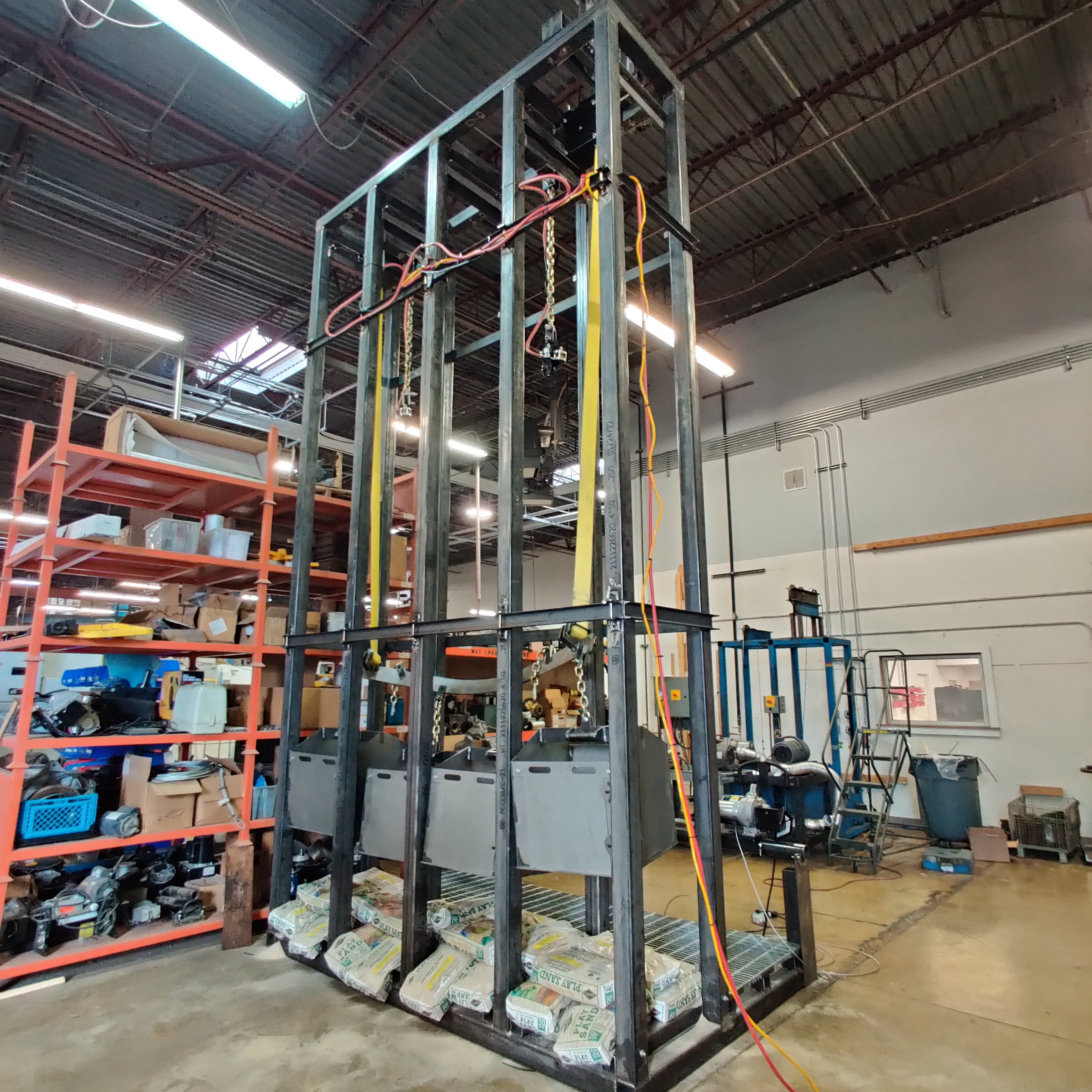 The old version of this winch cycle tester was ~8' tall and had a winch travel distance of only ~4'. The new version let us test winches with ~16' of travel. I worked on the core mechanical design of the structure as well as selection of the electrical components for the automation and monitoring systems. The control system uses a Siemens s7-1200 with several modules to monitor temperatures of the motors and gearcases, internal pressure of the gearcases, the weight being lifted, and the upper and lower limits of the lifting cycle. This design also doubles as a drop tester for testing safety catch equipment and has caught 7000lbs on a single drop.