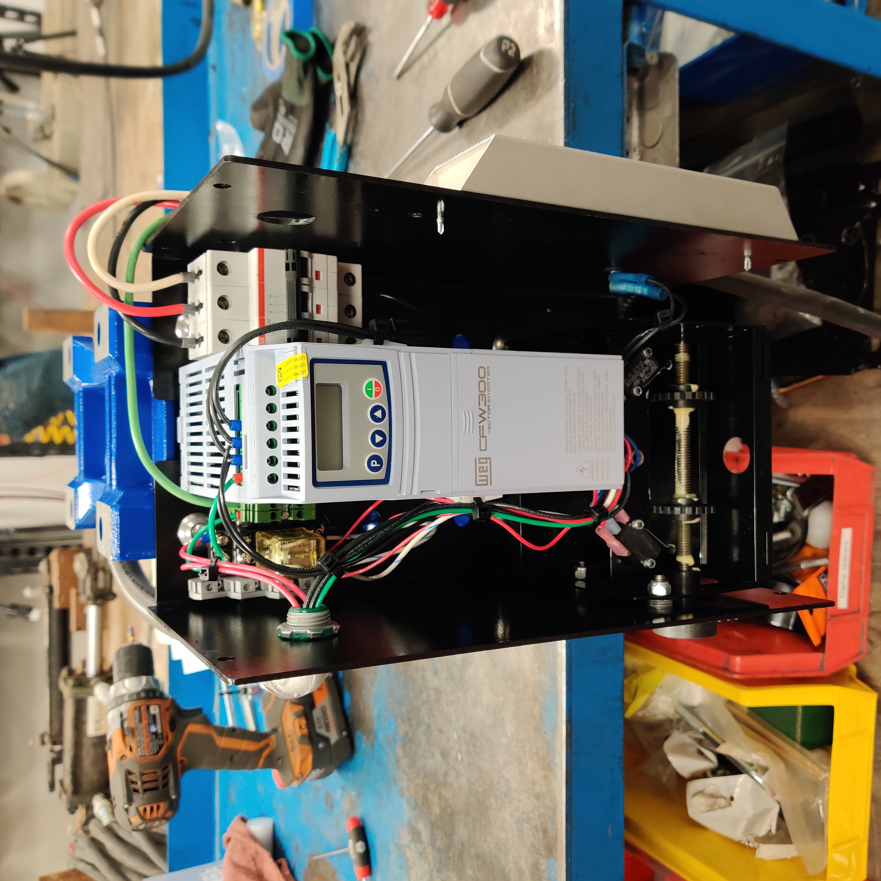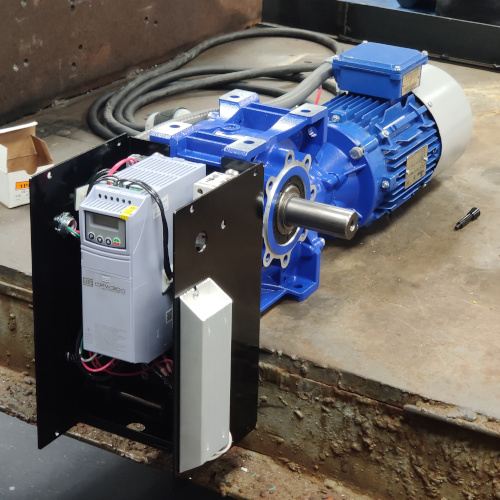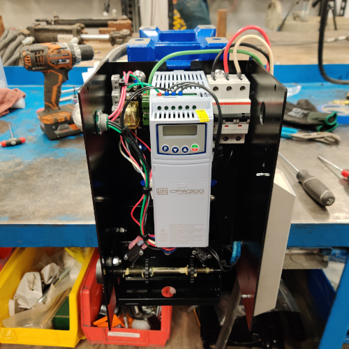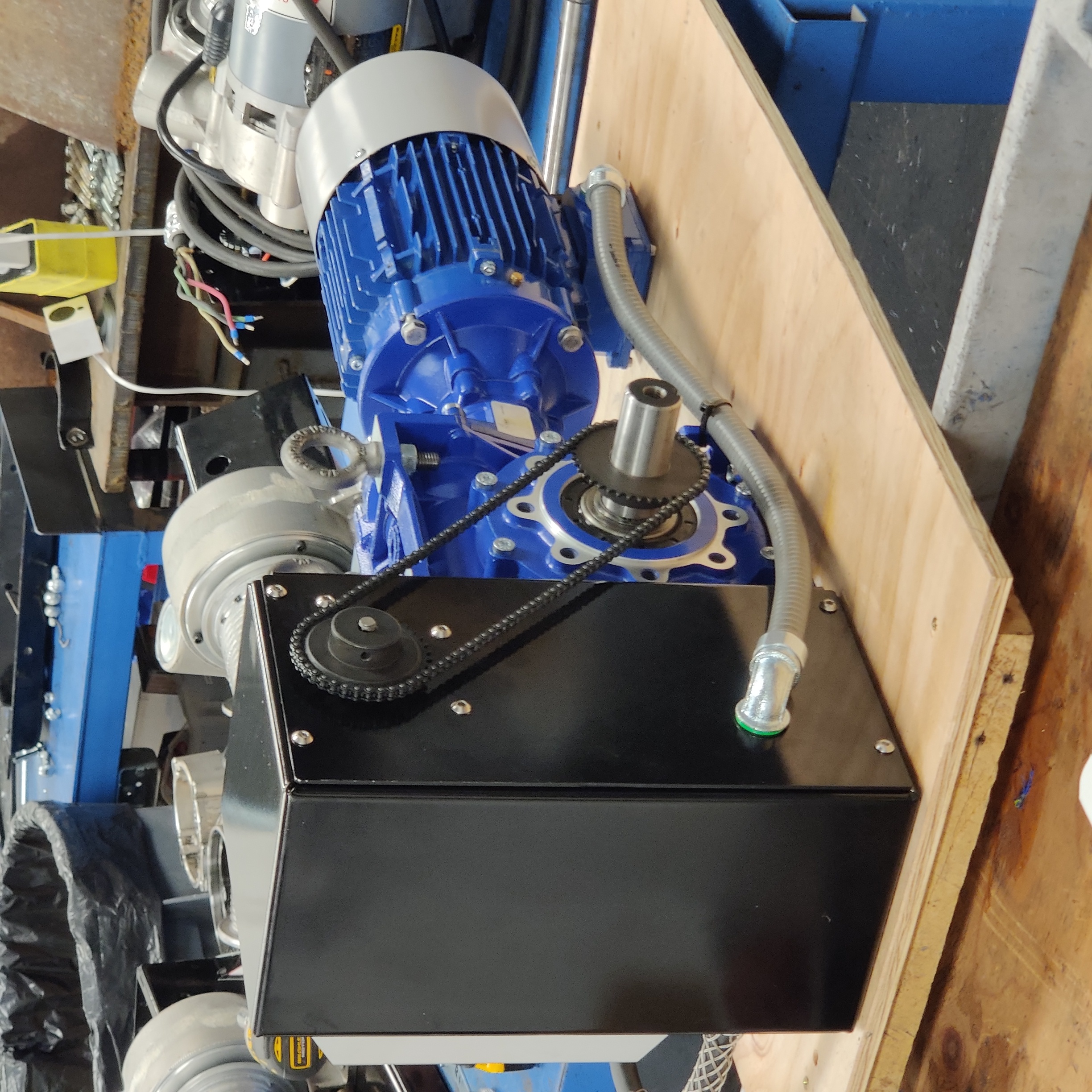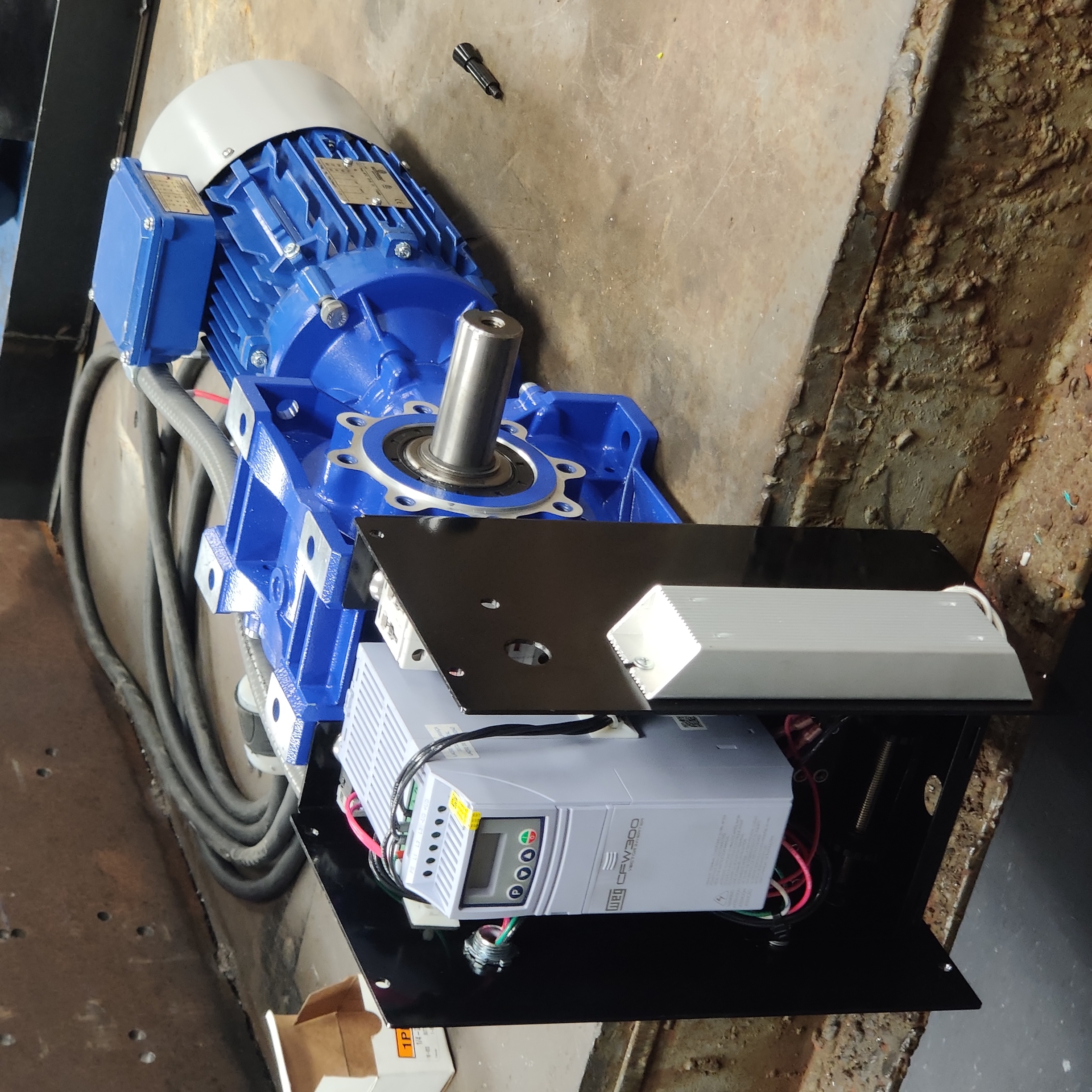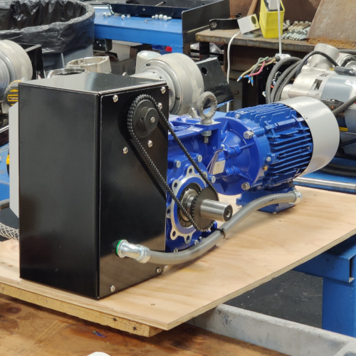 This design came from a customer with a custom request to build a very high capacity hoist. Success of this project led to repeat purchases as well as some other custom variations being produces. It used a large 220:1 double reducer with a 3-phase motor and brake. It was controlled by a WEG VFD and used our limit box custom fit to the new housing using a chain drive.